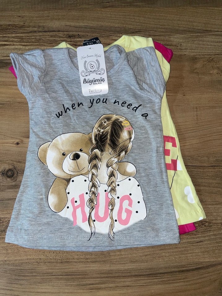 Gri renkli, pamuklu, kısa kollu ve salaş kesim kız çocuk tişörtü. Üzerinde örme dokulu baskı deseni vardır, sokak stiline uygun. 2-3 yaş.