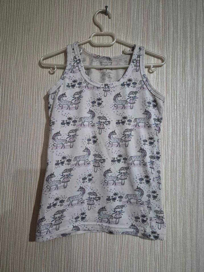 Kolsuz, gri baskılı ve beyaz dokuma kumaştan yapılmış, yuvarlak yakalı kız çocuk atleti. Şehir stili için uygun, rahat ve şık görünüyor.