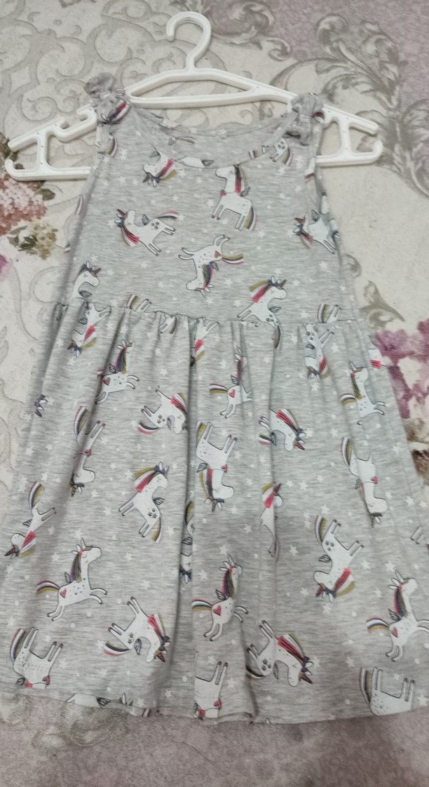 Unicorn baskılı, kolsuz, bol kesim gri elbise. Fırfır detaylı, straplez yakalı, bohem tarzda trend günlük kullanım için uygun.