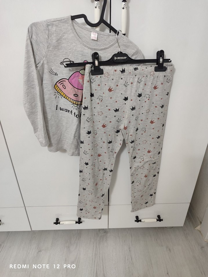 Kız çocuk gri baskılı pijama takımı, uzun kollu ve yuvarlak yakalı üst ile yumuşak pamuklu kumaştan yapılmış baskılı pantolondan oluşur. 8/9 yaş uyumlu leke yırtık yoktur..bunu bilerek alınız iade ve değişim yoktur