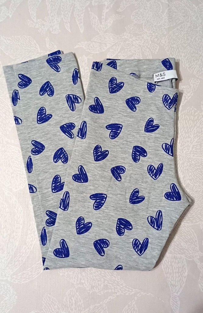Gri pamuklu kumaştan, elastik bel ve mavi kalp baskılı, kız çocuklar için dar kesim tayt.
