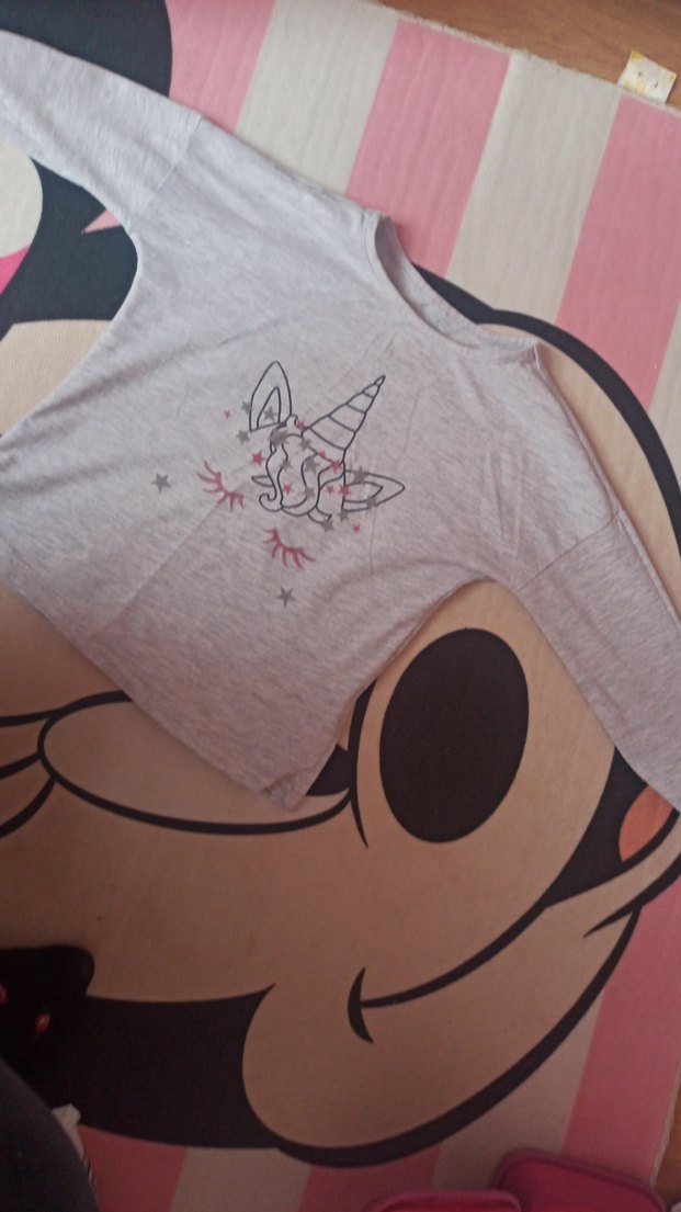 Pamuklu, uzun kollu, bol kesim kız tişörtü. Üzerinde baskılı unicorn deseni ve yuvarlak yaka bulunur. Rahat ve günlük stil için uygundur.
