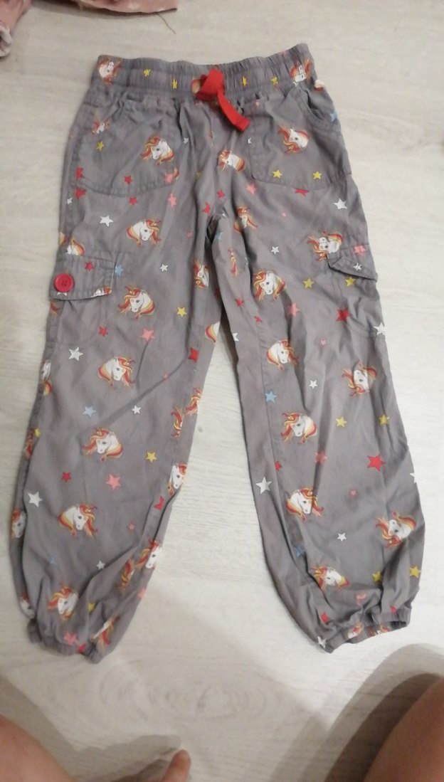 Kız çocukları için bol kesim gri pantolon, unicorn ve yıldız desenli. Yumuşak kumaştan, tokalı cepler ve lastikli paçalarla rahat ve trend görünümlü.