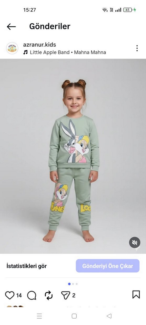 Uzun kollu, yuvarlak yaka ve yumuşak kumaşlı gri baskılı kız çocuk rahat takımı. Pastel tonlarda, Looney Tunes karakterleriyle süslenmiş, örme detaylı, sokak stili için uygun.