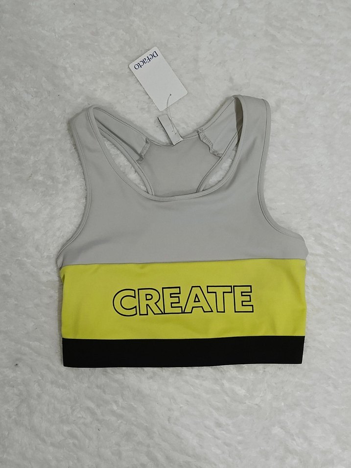Kız çocukları için yumuşak ve sıcak kumaştan, askısız, baskılı, gri, sarı ve siyah renk bloklu, fit kesim spor atlet. "CREATE" yazılı.