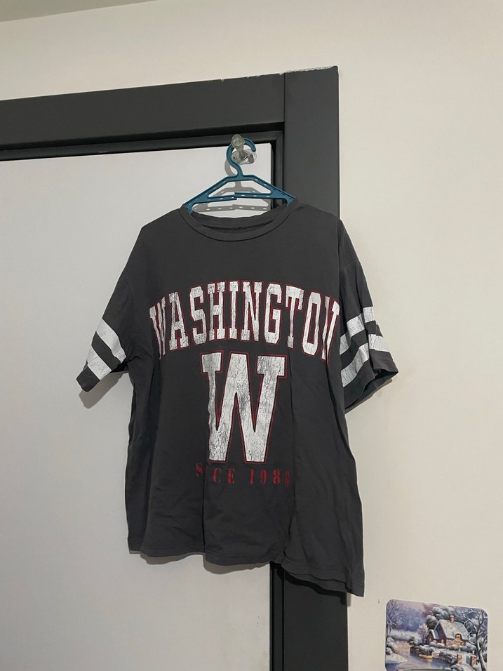 Gri renkli, bol kesim kız çocuk tişörtü. Kısa kollu, yuvarlak yaka, üzerinde Washington baskısı ve kollarda beyaz çizgiler var. Rock punk tarzına uygun.