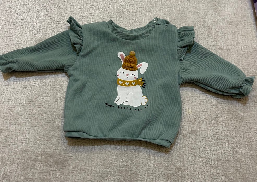 Gri renkli kız çocuk sweatshirt, yuvarlak yaka ve uzun kolludur. Rahat kesim, yumuşak ve sıcak kumaştan yapılmıştır. Önünde şapka ve atkı takan tavşan baskısı vardır.
