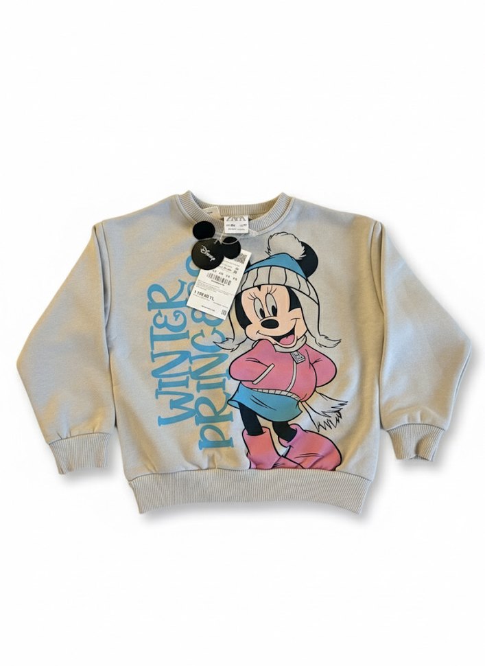 Kız çocukları için gri renkli, uzun kollu, bol kesim ve yuvarlak yaka sweatshirt. Yumuşak ve örme dokulu kumaştan olup, kış temalı renkli baskıya sahiptir. ❄️ #zarakids #mickyminnie #sweatshirt