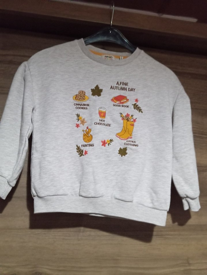 Gri renkli kız çocuk sweatshirtü, yuvarlak yaka ve uzun kolludur. Rahat kesimi ve yumuşak fleece kumaşıyla sonbahar temalı baskılar içerir. Örgü detaylarıyla sokak stiline uygundur.