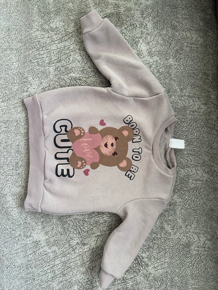 Kız çocuk gri sweatshirt, yuvarlak yaka ve uzun kolludur. Yumuşak ve sıcak kumaştan yapılmış, sevimli ayı baskısı ve 'GUTE' yazısı ile tüylü detay içerir. Rahat kesimdir. Defosu ve lekesi yoktur