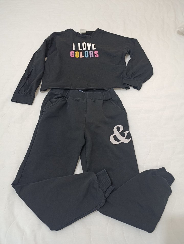 Gri renkli, baskılı "I LOVE COLORS" yazılı sweatshirt ve eşofman takımı, rahat kesimi ve uzun kollu tasarımıyla sokak modasına uygun, şık ve rahat bir kombin sunar.