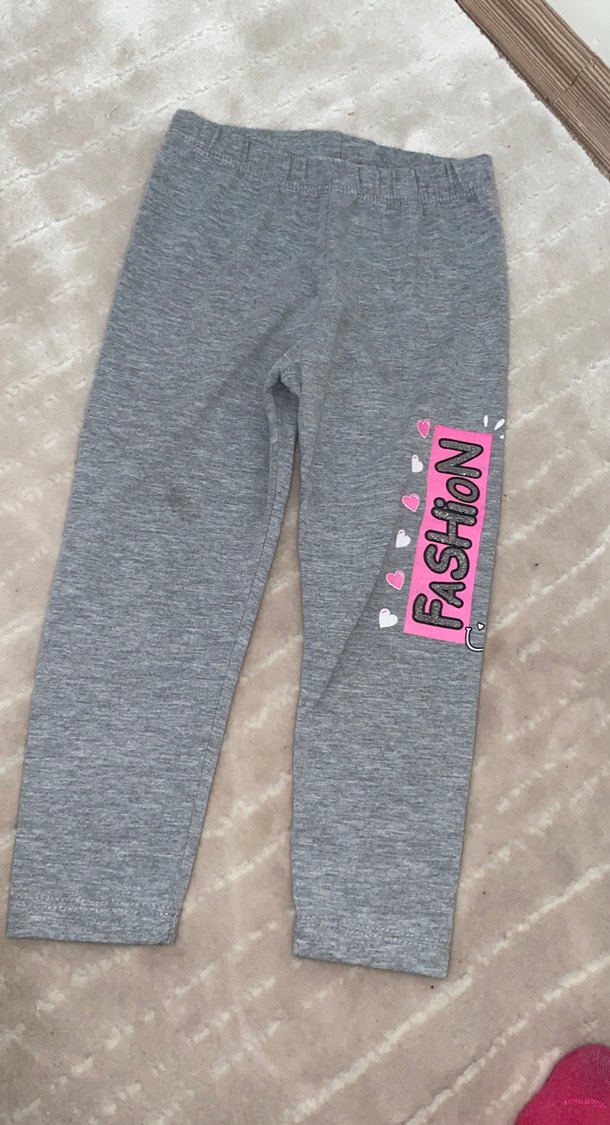 Kız çocukları için elastik bel bantlı, kalıplı gri tayt. "FASHION" yazılı baskı ve kalp desenleri içerir, yumuşak ve sıcak kumaştandır.