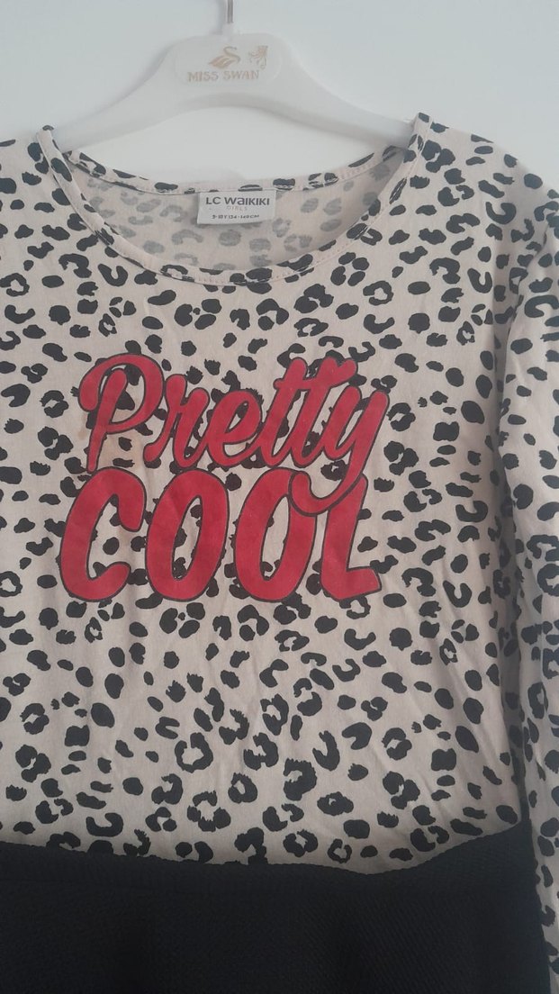 Kız çocukları için, yumuşak sentetik kumaştan üretilmiş, baskılı gri leopar desenli, kırmızı "Pretty Cool" yazılı, uzun kollu ve kürklü detaylı dar kesim elbise