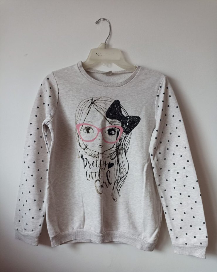 İki koltuk altı arası 45cm. Omuzdan boy 57cm. Kız çocukları için pamuklu sweatshirt, uzun kollu ve puantiyeli kollara sahiptir. Üzerinde gözlük ve fiyonk detaylı baskı bulunur. Rahat kesimli ve yuvarlak yakalıdır, örme dokudadır.