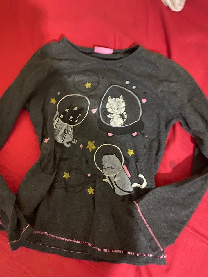 Gri renkli, uzun kollu, baskılı, fitted kesim kız çocuk tişörtü. Yumuşak örme kumaştan üretilmiş, crew neck yaka ve uzay temalı kedi baskısı bulunur.