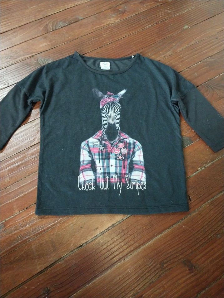 Kız çocukları için gri renkli, uzun kollu, baskılı zebra figürlü ve yazılı tişört rahat kesim ve yuvarlak yaka ile tasarlanmıştır. Koltuk altına dan koltuk altına 40cm,boy 47cm.1 kere giyinmis hiç delik leke yırtık vb yok. F+F markası