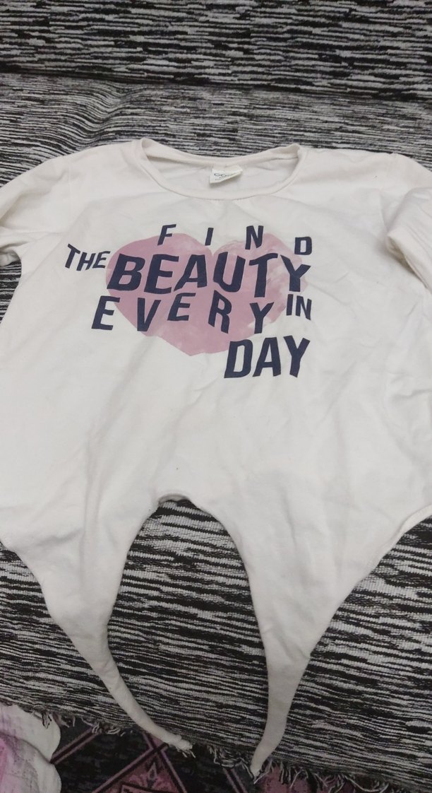 Beyaz renk, uzun kollu, bol kesim kız çocuk tişörtü. Pamuklu kumaştan, önünde 'Find the beauty in every day' baskısı bulunur. Rahat ve gündelik stil için uygundur.