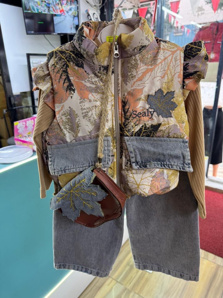 Gri batik desenli, askısız yaka, fermuarlı, bol kesim kız çocuk denim yelek.