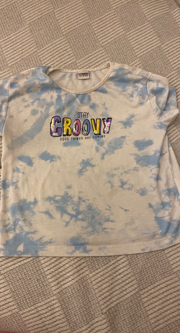 Kız çocukları için pastel gri batik desenli, kısa kollu ve yuvarlak yakalı pamuk tişört. Bol kesim, renkli "CROOVY" baskılı.