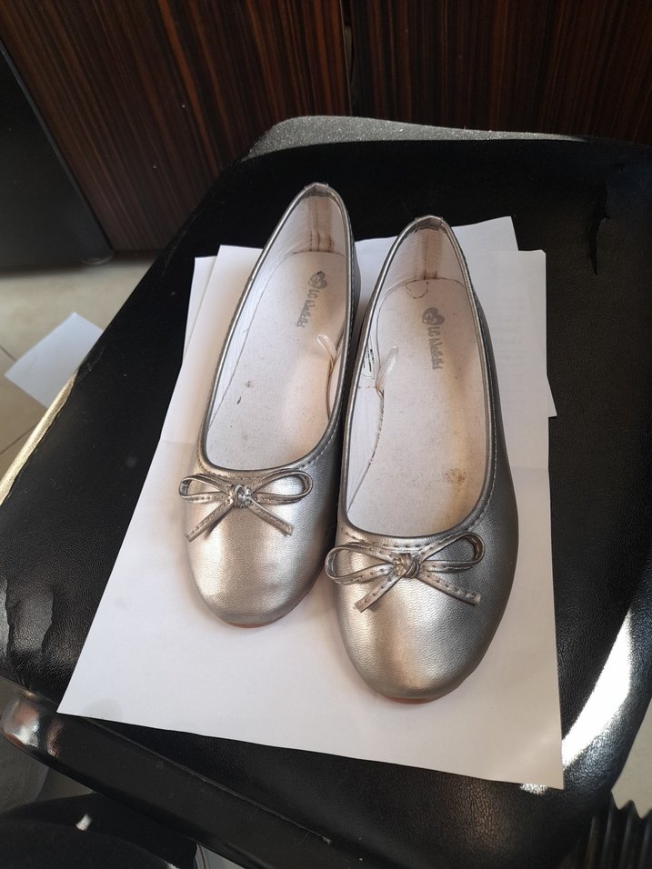 Gri ve bej renklerde, tokalı detaylı, kauçuk malzemeden yapılmış modern kız çocuk balerin ayakkabısı. Desensiz tasarım.