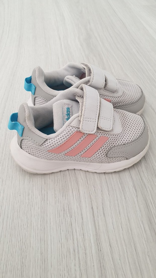 Gri ve beyaz renklerde, pembe baskılı çizgili ve cırt cırtlı kız çocuk spor ayakkabısı. Kauçuk tabanlı, sokak stiline uygun.