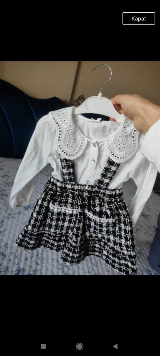 Kız çocuk için uzun kollu, yakalı ve işlemeli fırfırlı detaylı, gri beyaz kareli cepli triko elbise. Rahat kesimli, günlük şık tarz için uygundur.