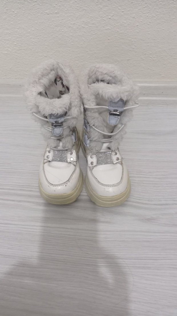Beyaz ve gri renklerde, kürklü detaylı ve yumuşak tüylü iç astarlı kız çocuk spor botu, trend sokak stili için uygun.