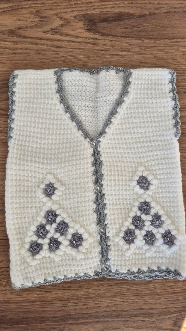 V yaka, kolsuz, nakışlı gri-beyaz desenli kız çocuk triko süveter, bol kesim. yelek el örgüsü 1 2 3 yaşa kadar olur .