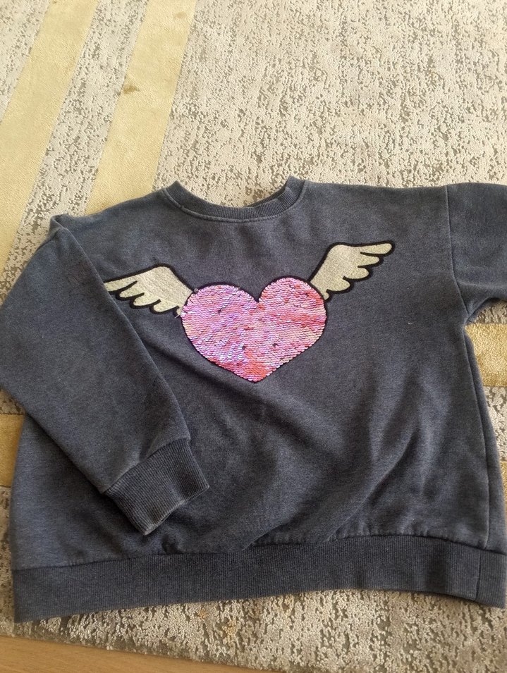Kız çocuk için gri renkli, bisiklet yaka ve uzun kollu, rahat kesim örme kumaştan sweatshirt. Önünde kanatlı kalp baskısı bulunur. kollarını desenler silinmiş ragatsız eden bir görüntü yok. yırtık sökük yok.