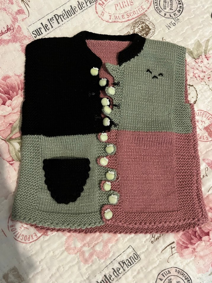 Kız çocukları için bohem tarzda, gri, siyah ve pembe blok renklerde, düğmeli ve küçük cepli, örgü yelek. Rahat kesimli ve kolsuz, dePiano markalı.
