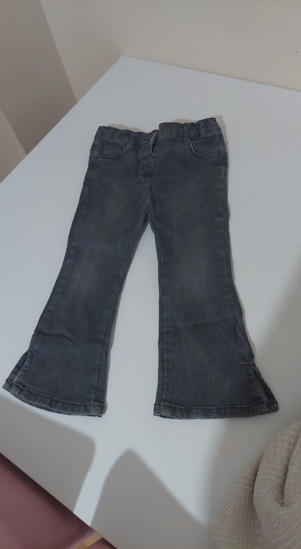 Kız çocukları için bol kesim, gri renkli, tokalı bel bandına sahip denim pantolon. Normcore tarzda ve trend görünümlü.