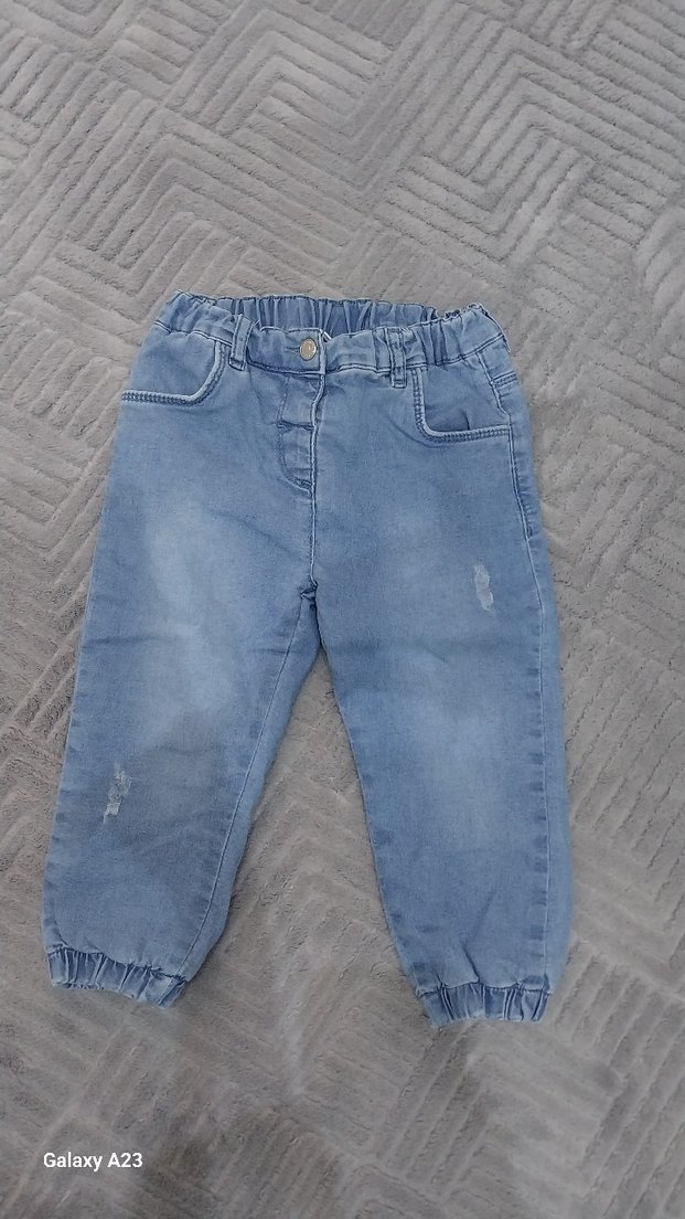 Kız çocuklar için düğmeli ve lastikli paçalı, bol kesim gri denim pantolon, rahat ve günlük stil sunar.