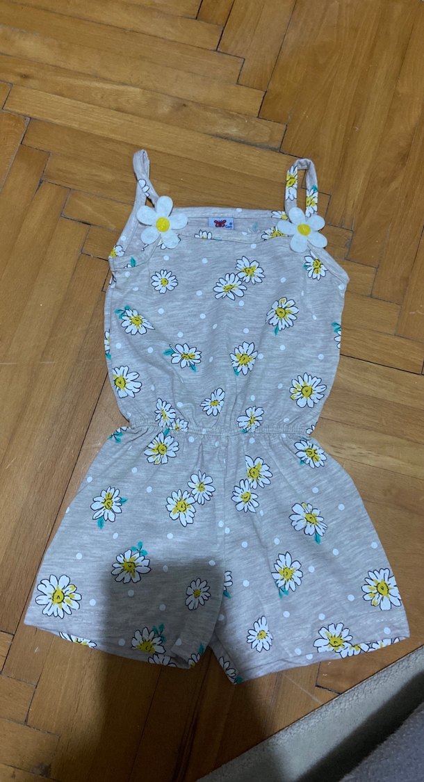Gri çiçek desenli, kolsuz, bol kesim kız çocuk tulumu, bel kısmı lastikli. Rahat sokak stili için uygun. 2-3 yaştır