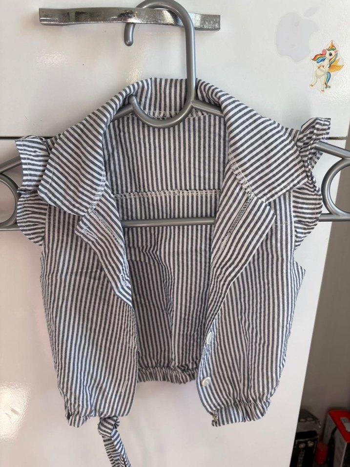 Keten kumaştan, gri çizgili, yakalı ve pile detaylı, kolsuz, vücuda oturan kız çocuk bolero. Trendy ve rahat bir sokak stili için uygundur.