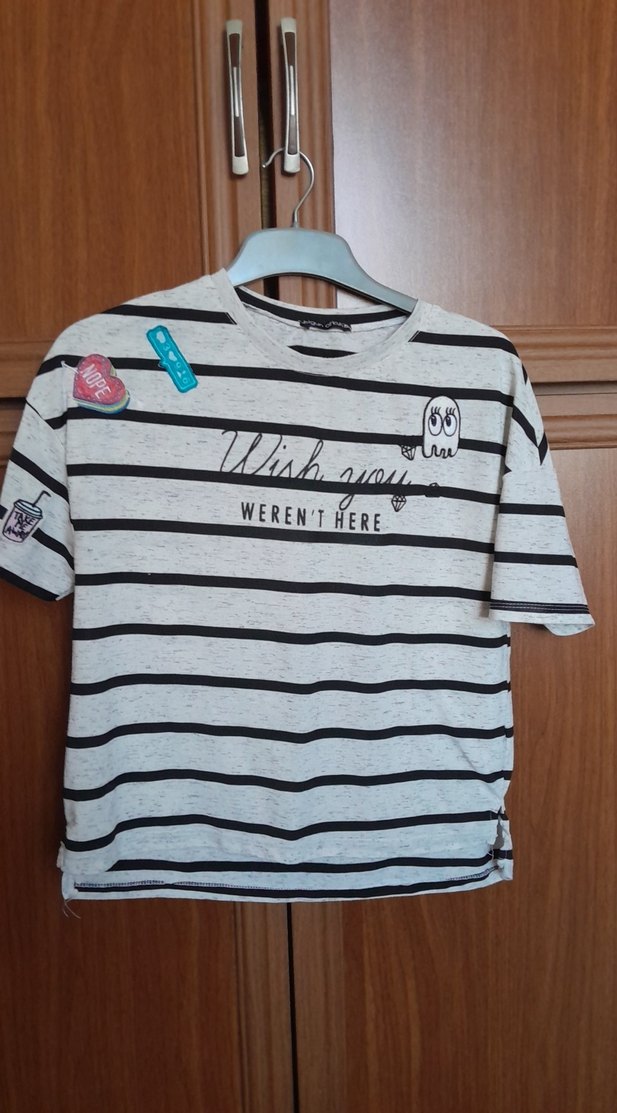 Gri, kısa kollu, yuvarlak yakalı, bol kesim kız çocuk tişörtü. Siyah çizgiler, düğme detayları ve "WERENTHERE" yazılı baskılı desenler içerir.