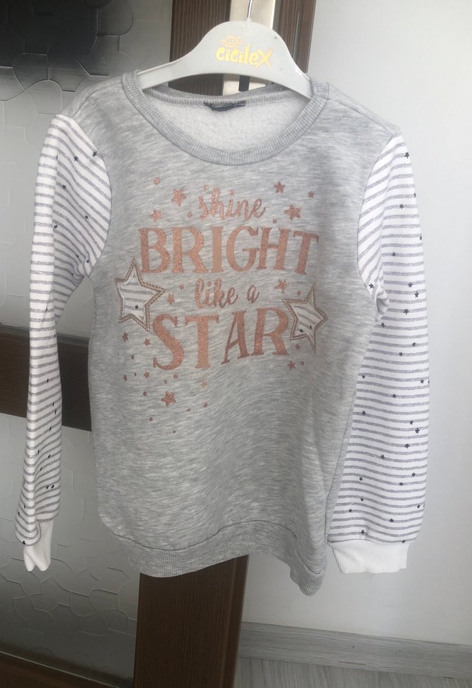 Gri renkli, uzun çizgili kollara ve yuvarlak yaka sahip kız çocuk sweatshirtü. Bol kesim ve simli 'shine BRIGHT like a STAR' baskılı detay içerir. ✨6-7 yaş