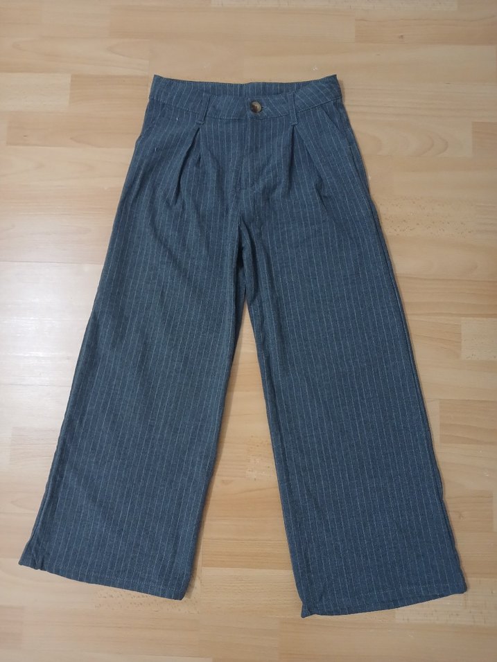 kiz cocuklari icin gri kumaş pantolonlar, pileli tasarım ve normal kesim ile tam boyda, günlük rahat kullanım için uygundur. İnce çizgili desensiz kumaştan üretilmiştir.
