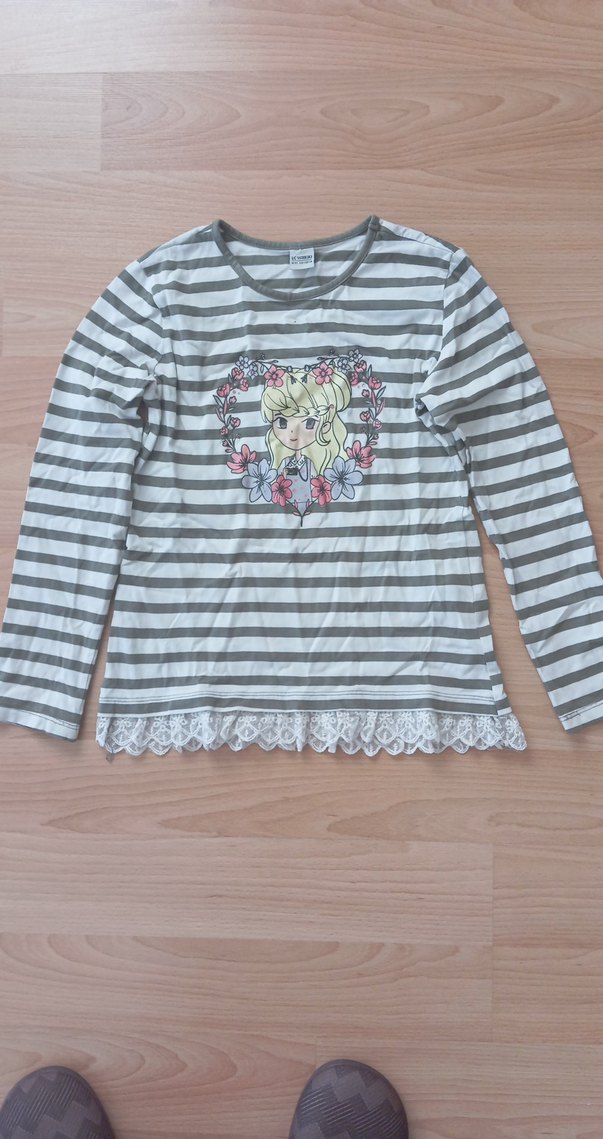 Fiyatını uygun yazdım çünkü. küçük bir kusuru var fotoğrafta belirttim.Kız çocuk gri çizgili uzun kollu tişört, yuvarlak yaka ve bol kesime sahiptir. Önünde baskı ve etek ucunda dantel detay bulunur, yumuşak örme kumaştandır.