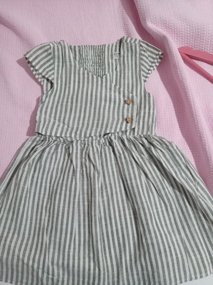 Gri çizgili, V yakalı, düğmeli detaylı, askılı kollu, bol kesim kız çocuk elbisesi. Yumuşak sentetik kumaştan üretilmiştir.