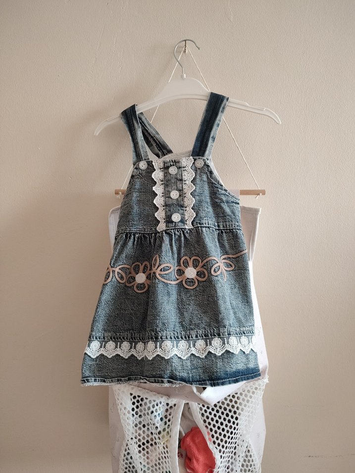 Gri renkli, nakışlı desenler ve dantel detaylı kız çocuk denim elbise. Salaş kesim, askılı ve straplez yakaya sahip, bohem tarzı yansıtıyor.