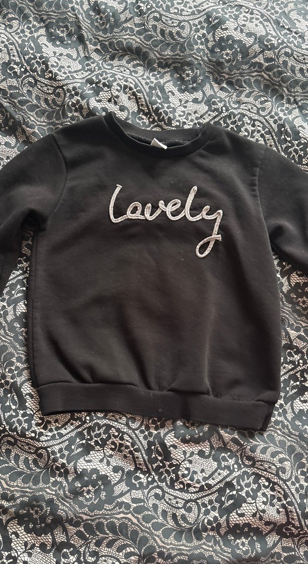 Kız çocuk için uzun kollu, bol kesim ve yuvarlak yakalı gri triko sweatshirt. Dantel detaylı, desenli ve önünde "lavely" nakışlıdır.