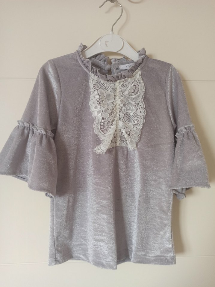 Gri renkte, yarım kollu, dantel ve nakış detaylı ince kadife kumaştan, bol kesim bohem tarzda kız çocuk bluz