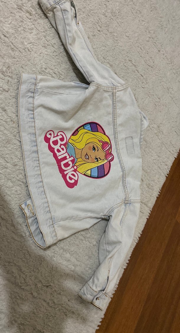 Kız çocuklar için fitted kesim gri denim ceket, düğmeli ve yakası kesik detaylıdır. Arkasında pastel tonlarda Barbie baskısı vardır, bohem ve retro tarzı yansıtır.