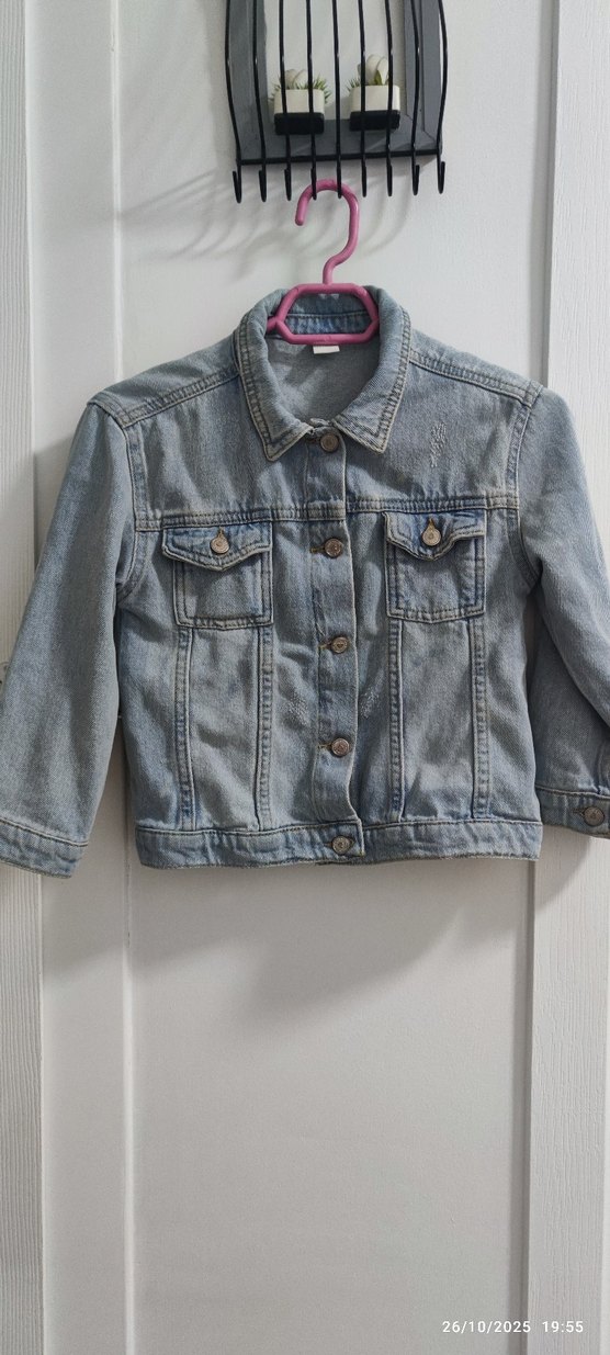 Gri denim kumaştan, düğmeli ön ve kesik yakalı, fitted kesim kız çocuk ceketi, sokak stili için uygundur.