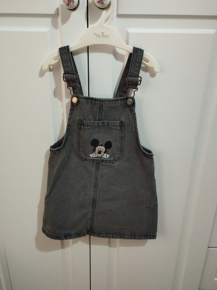Düğmeli askıları ve ön cepten baskılı Mickey Mouse deseniyle gri renkli, kolsuz, fitted kesim denim elbise.