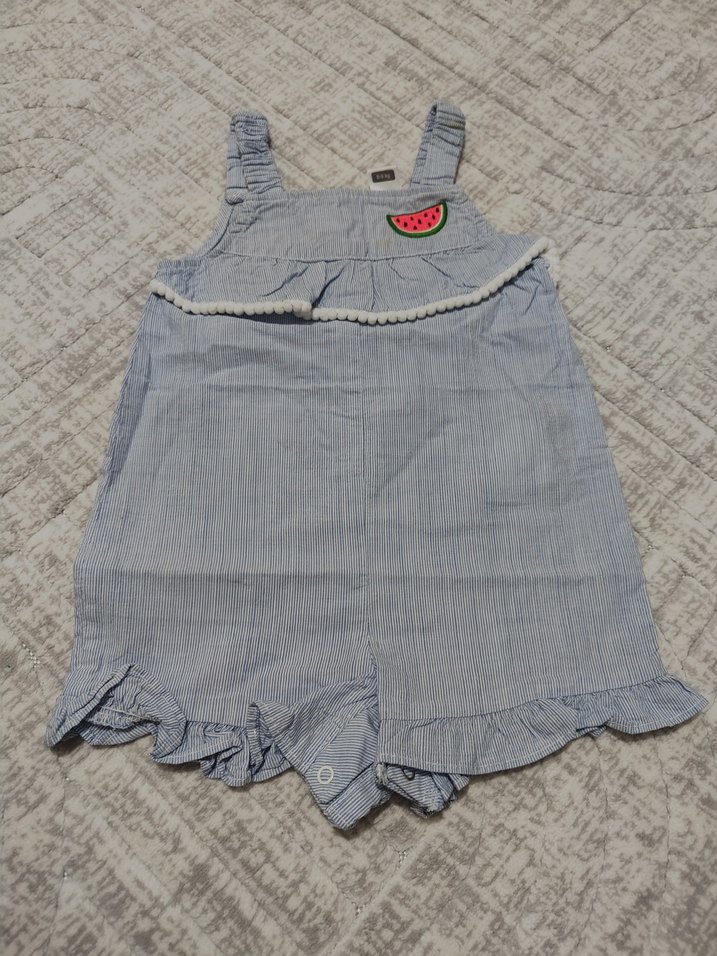 Gri renkli, fırfırlı askılı ve nakışlı karpuz detaylı, bol kesim kız çocuk denim tulumu.