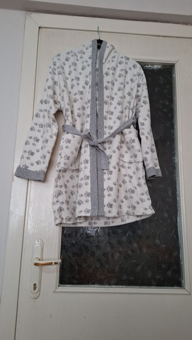 Kız çocukları için yumuşak ve sıcak kumaştan, gri desenli kapüşonlu, cepli ve kuşaklı bornoz. 12 yaş
