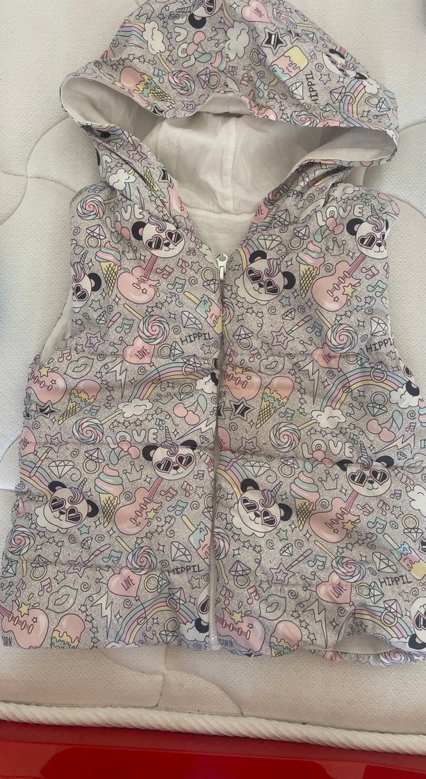 Kız çocukları için gri, renkli baskılı desenlere sahip kapüşonlu, düğmeli ve ince kesim yelek.