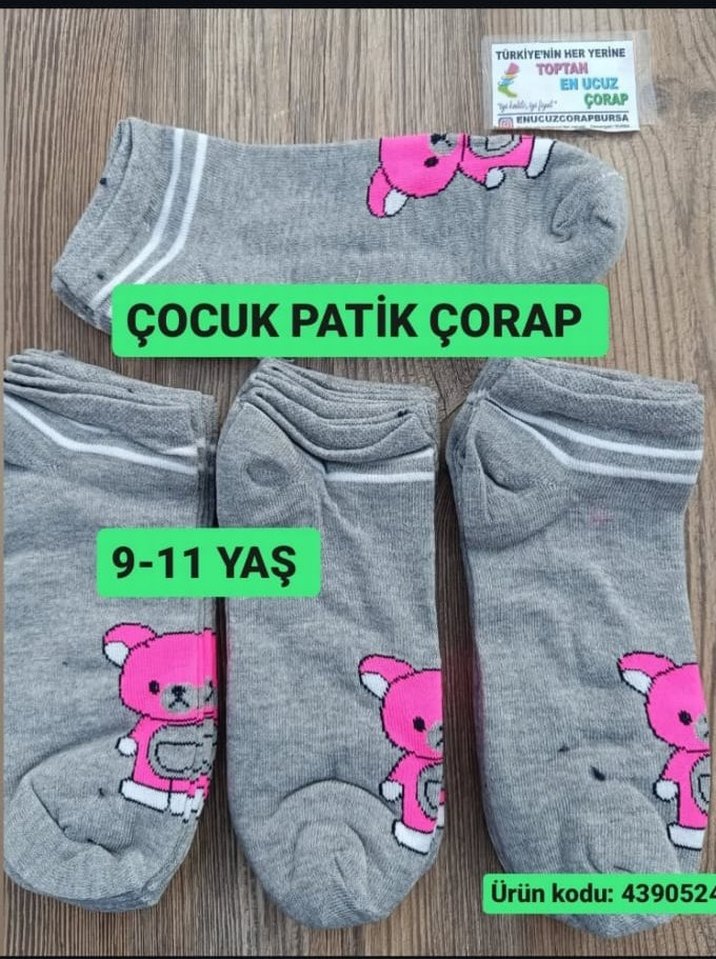 9-11 yaş kız çocukları için gri, pembe ayıcık desenli yumuşak ve sıcak patik çoraplar.6 çift 100 tl