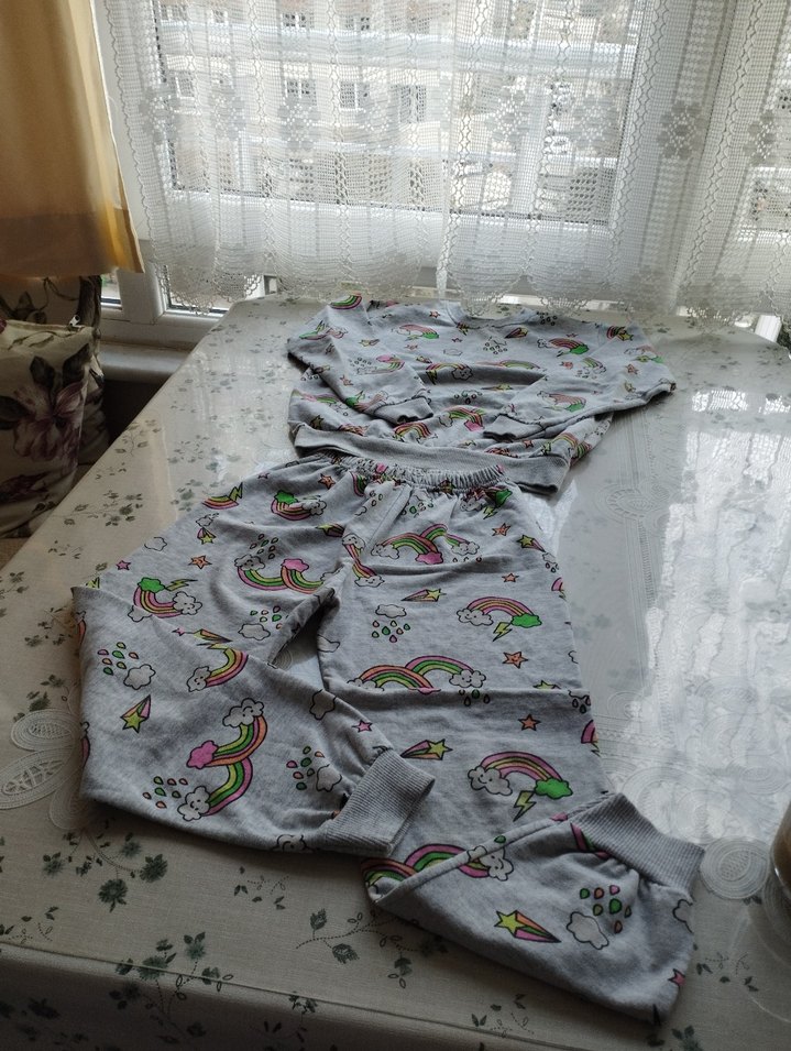 Gri renkli, örme kumaştan yapılmış kız çocuk pijama takımı, uzun kollu ve yuvarlak yakalıdır. Üzerinde renkli gökkuşağı ve yıldız desenleri bulunur.